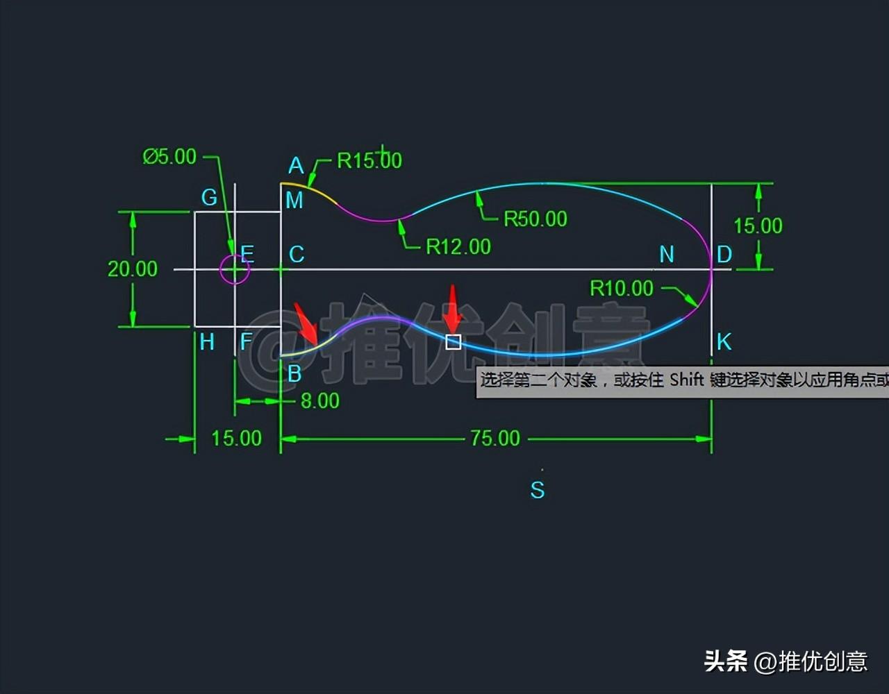 2.22、命令行输入“F ”后回车,启用“圆角 ”命令,接着输入“R ”后回车,选择设置圆角半径 ,输入圆角的半径值 “12 ”后回车,对上面 的黄色圆弧 与青色圆弧 倒圆角。