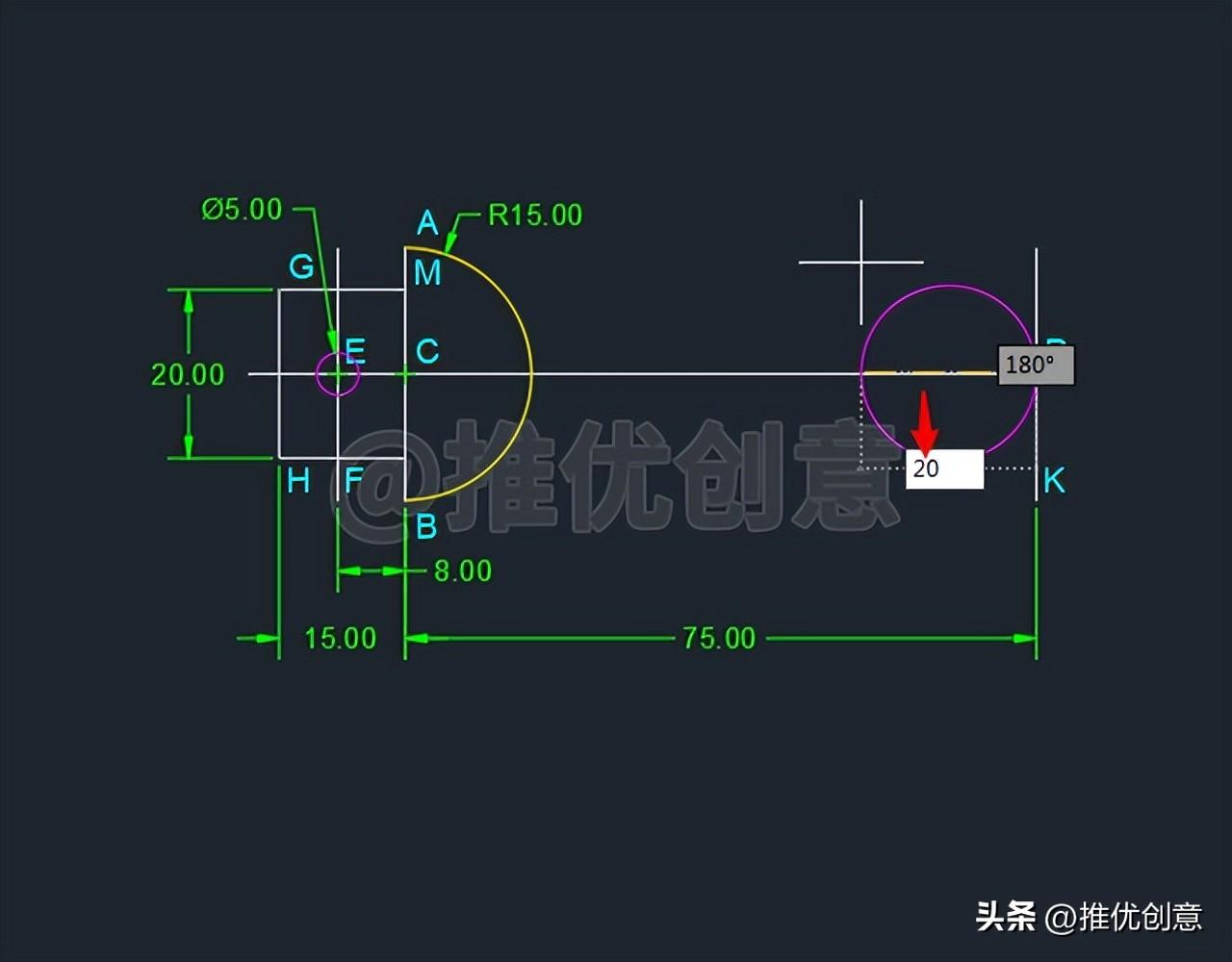 2.20、这样就绘制出了一个半径 为8 个单位的青色圆G ,圆心G 相对于点C 的相对坐标值 为“@8,5 ”。