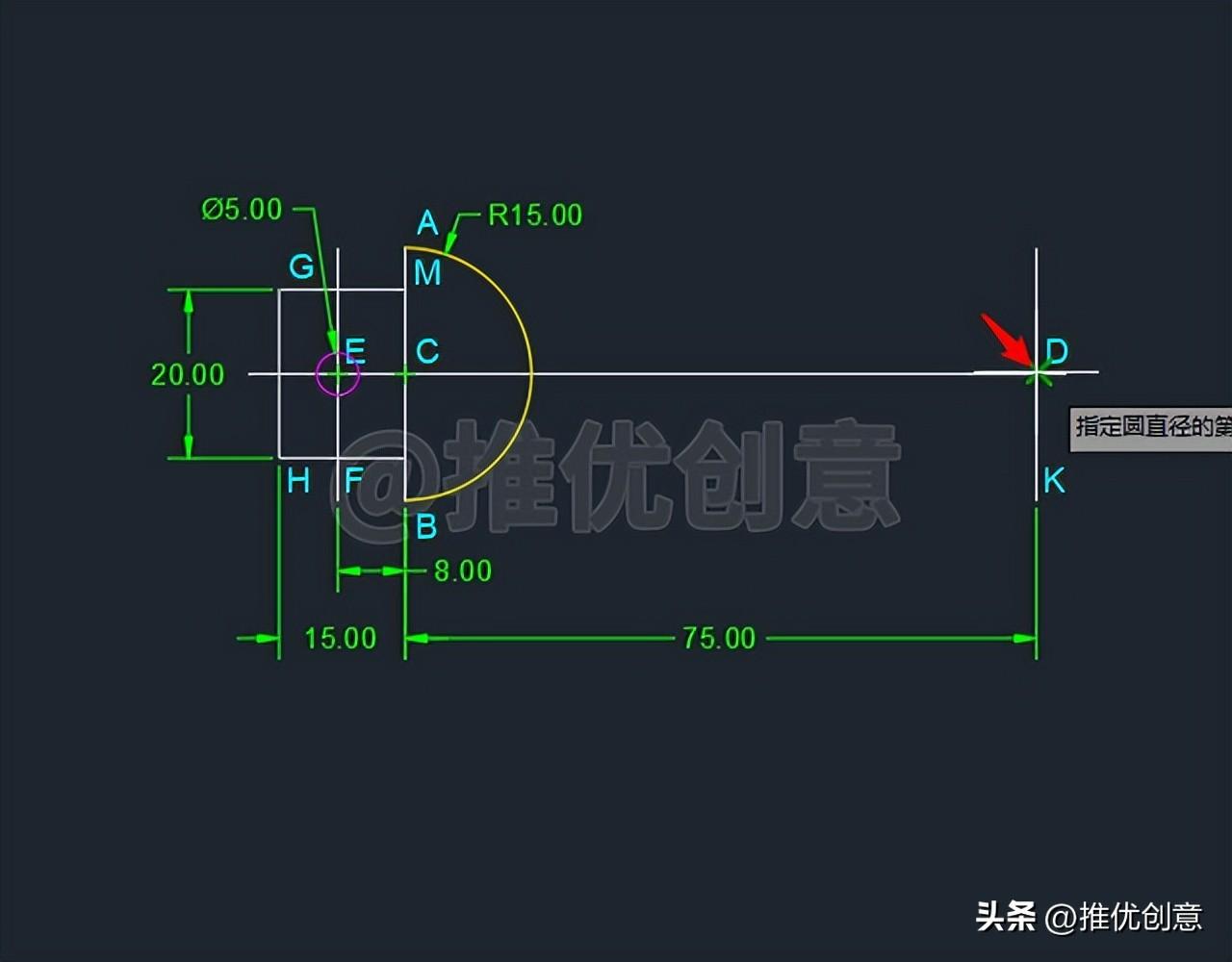 2.10、单击捕捉交点D 作为圆的直径的第一个端点 。