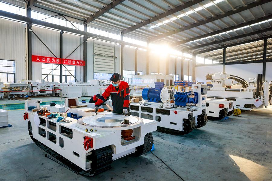 12月4日,山东九商工程机械有限公司生产车间内,工人在组装大功率超深孔定向钻机。