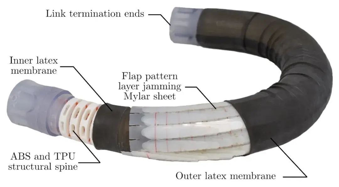 据介绍,该臂可弯曲部分的内部由一层又一层的聚酯薄膜片组成,这些薄片被切成薄片并彼此堆叠,从而使每个薄片与至少11个其他薄片重叠。聚酯薄膜很滑,在大多数情况下,襟翼可彼此平滑移动,从而可以调节手臂的形状。襟翼被密封在乳胶膜之间,当空气从膜之间被抽出时,它们相互向下压使整个结构变硬,将其自身锁定为您放入的任何形状。