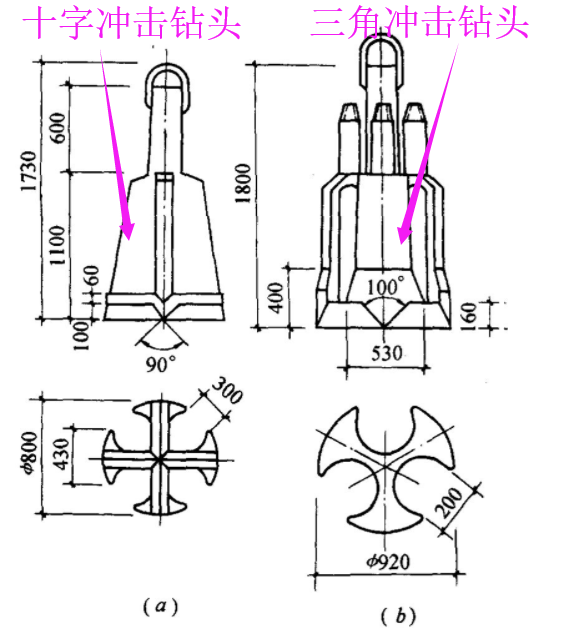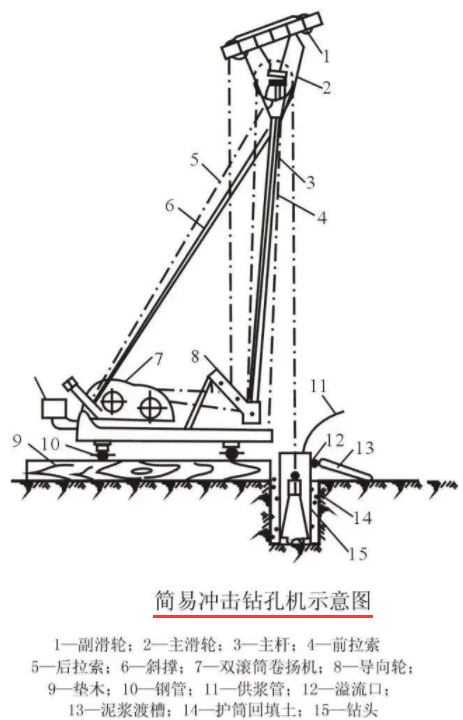 注:冲击钻机通过机架、卷扬机把带刃的重钻头(冲击锤)提高到一定高度,靠自由下落的冲击力切削破碎岩层或冲击土层成孔