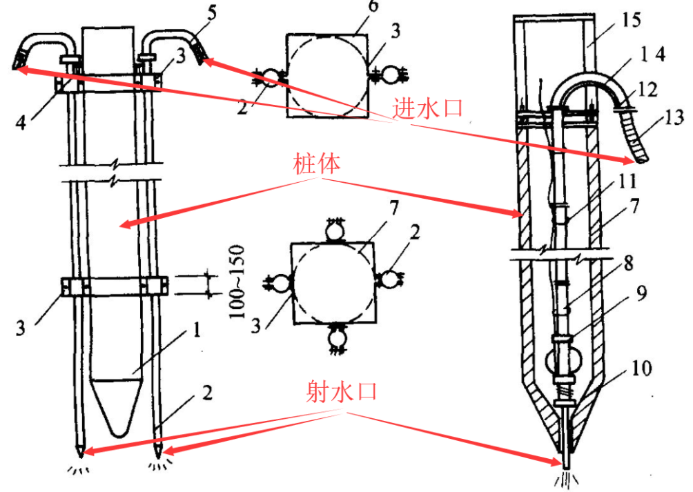 ▼射水辅助沉桩(用高压水冲散土体,并形成润滑效果)