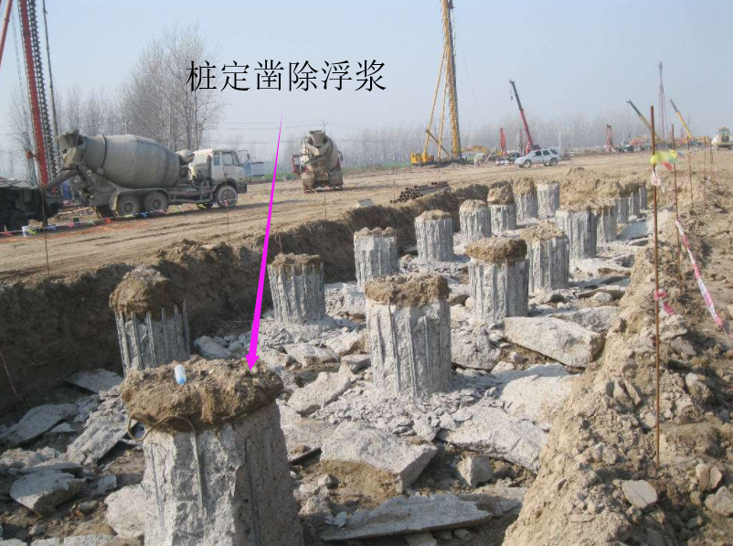 6.桩顶混凝土浇筑完成后应高出设计标高0. 5~lm,确保桩头浮浆层凿除后桩基面混凝土达到设计强度。