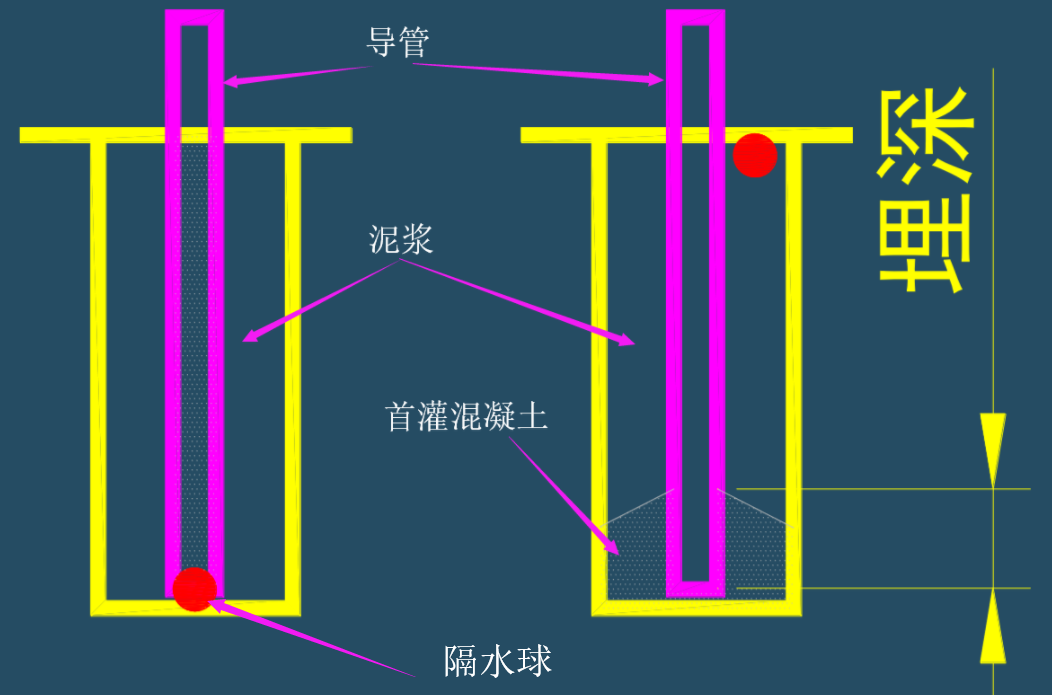 注:浇注水下混凝土不能将混凝土直接倾倒于水中。因为当混凝土直接与水接触穿过水层时,骨料和水泥很快将产生分离,骨料很快沉入水底,而水泥在较长时间内呼吁悬浮状态,当其下沉时,已凝结硬化。因此水下混凝土的浇注,必须在与周围环境水隔离的条件下进行。水下混凝土浇筑的方法很多。最常用的是导管法。