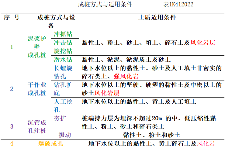 依据成桩方式可分为①泥浆护壁成孔、②干作业成孔、③沉管成孔灌注桩及④爆破成孔 ,施工 机具类型及土质适用条件可参考表1K412022。