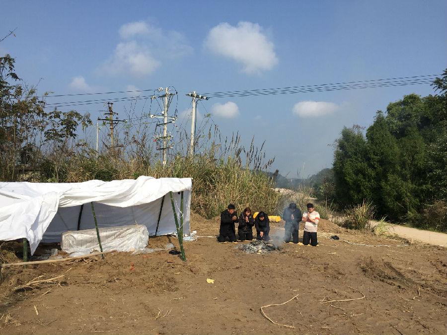 11月26日上午,记者来到四川营山县消水镇峰台村一组名为“千丘田”的山顶上看到,临时搭建的白色帐篷内安放着一口刚出土的棺材,并用塑料包裹着,一群男女跪地痛哭不止。