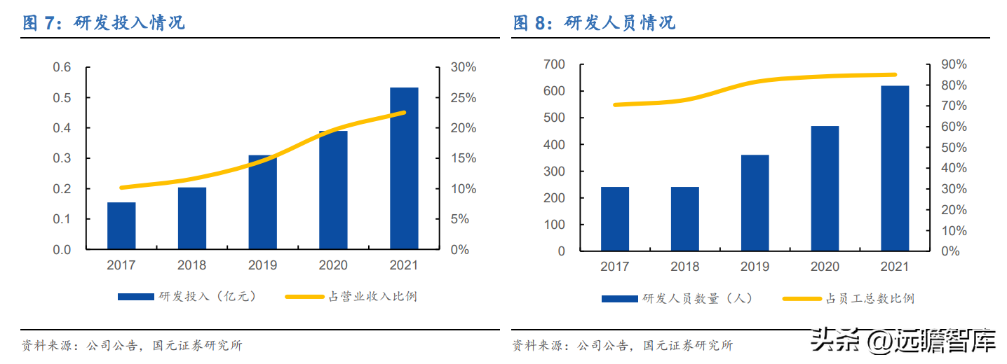 2021 年,公司研发投入为 0.53 亿元,占营业收入的 22.53%,研发团队从 2019 年的 361 人快速增长至 2021 年的 620 人。