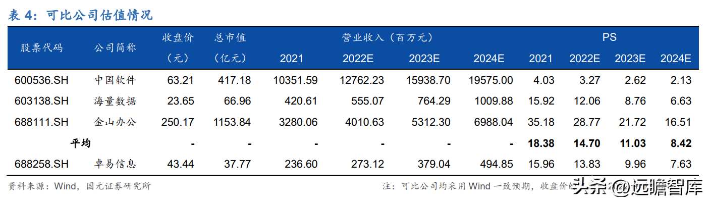 可比公司估值: 在国内上市公司中,中国软件、海量数据、金山办公从事信创行业相关业务,公司部分业务也属于信创行业,因此我们选择这三家公司作为可比公司。