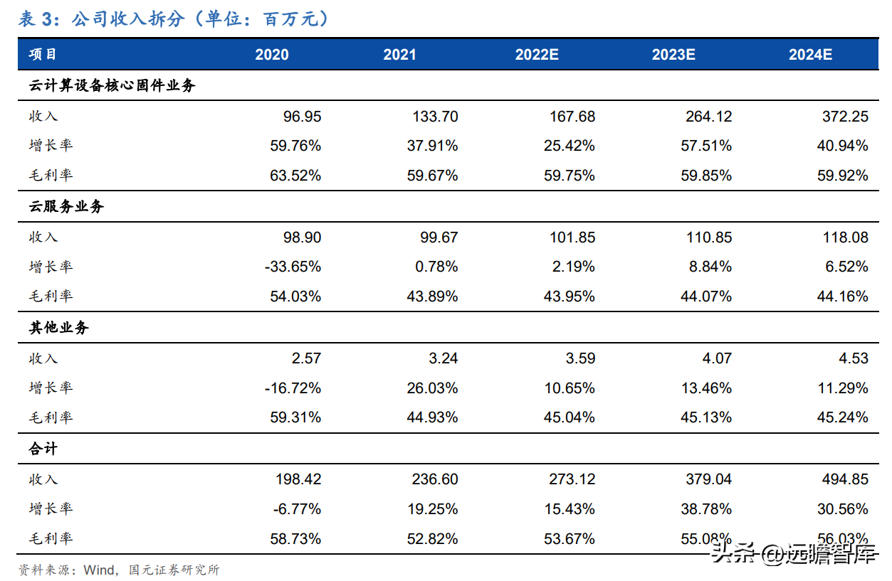 目前,公司产品(业务)主要包括:云计算设备核心固件业务、云服务业务、其他业务,我们按照这三个维度预测公司未来的收入和毛利率情况。