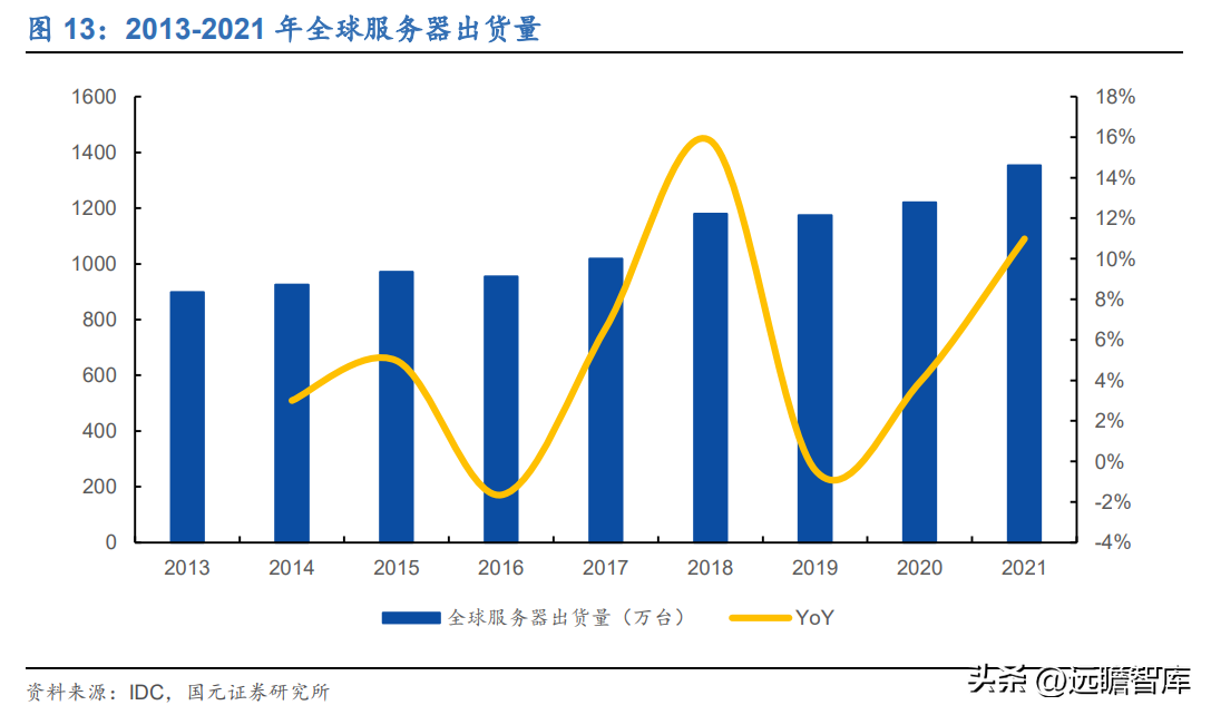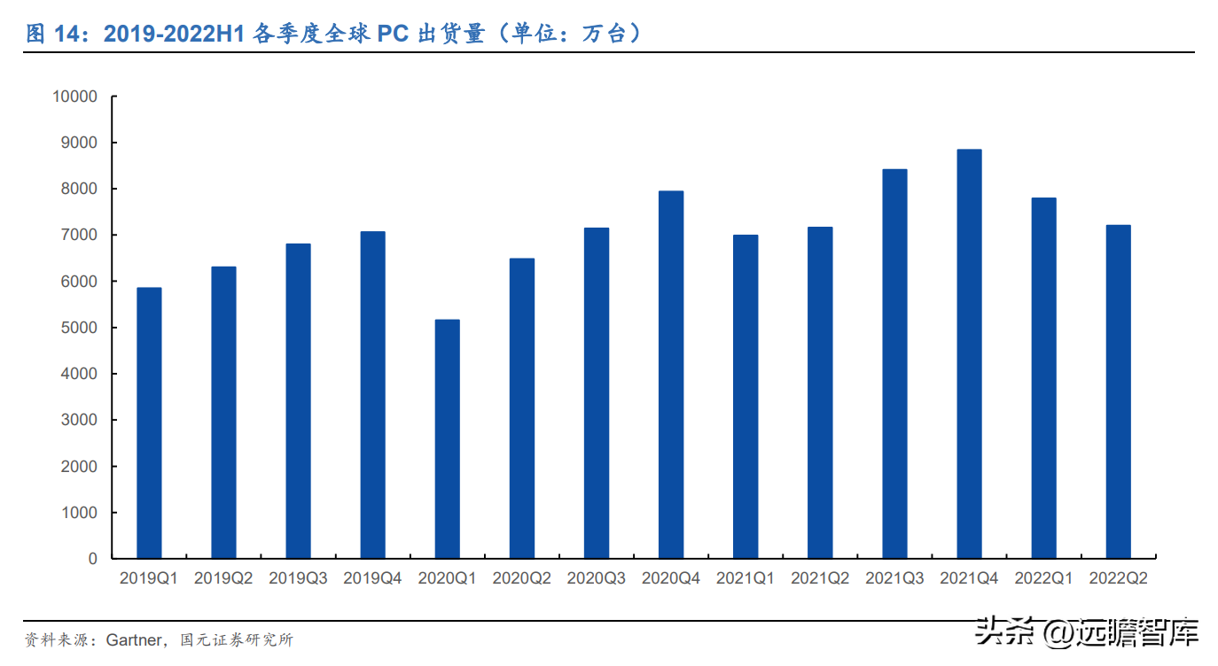 根据 IDC 数据,2021 年全球服务器市场出货量为 1353.9 万台,同比增长 11%。根据 Gartner 数据,2021 年全年 PC 总出货量约为 3.14 亿台,同比增长 17.5%,自 2012 年以来 PC 市场年出货量达到新高;2022H1 全球 PC 出货量约为 1.50 亿台,同比增长 5.94%。