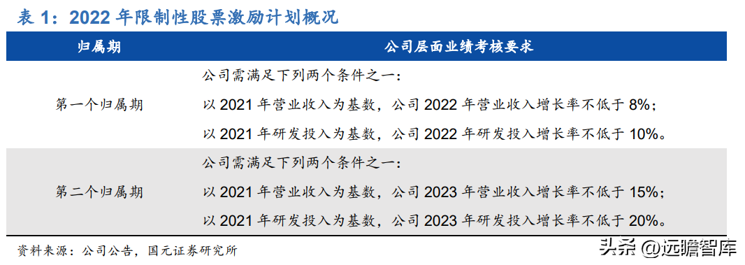 本激励计划限制性股票的归属考核年度为 2022-2023 年两个会计年度,每个会计年度考核一次,公司层面业绩考核要求:以 2021 年营业收入为基准,2022 和 2023 年营业收入的增长率分别不低于 8%和 15%或以 2021 年研发投入为基准,2022 和 2023 年研发投入的增长率分别不低于 10%和 20%。