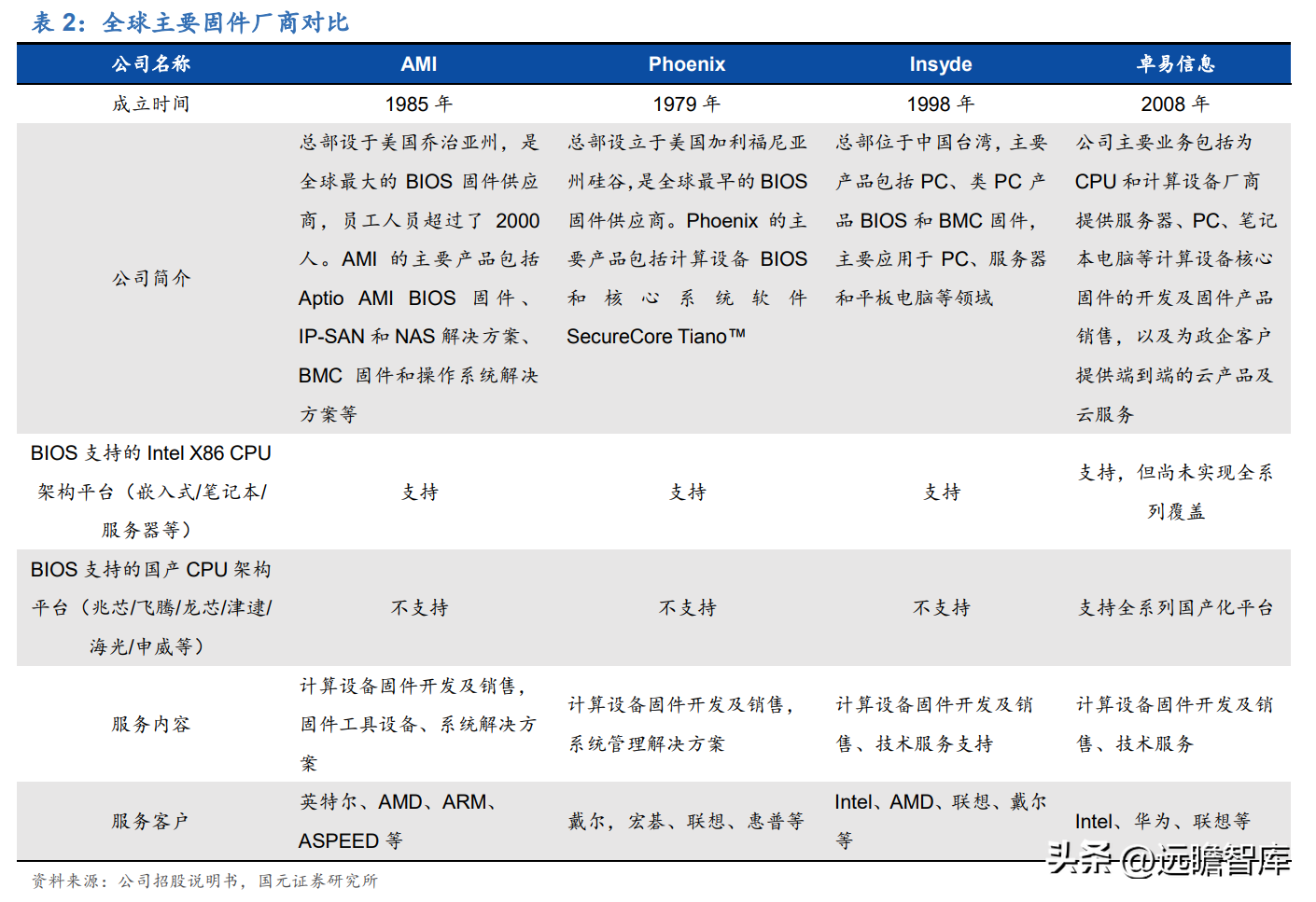 固件业务方面,公司是全球四家之一的 X86 架构 CPU 固件独立供应商,具备国产各种 CPU 架构固件的配套能力,能够满足国产、自主、可控关键环节的需要,未来有望深度受益于信创产业的快速发展。