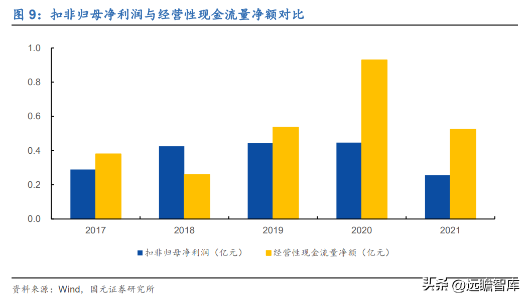 2017-2021年,公司经营性现金流量净额分别 0.38、0.26、0.54、0.93、0.52 亿元。公司经营性现金流量净额较为充裕,除 2018 年外,其余年份净现比均大于 1。