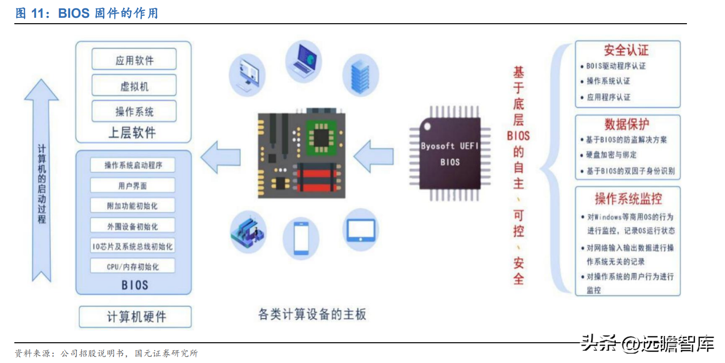 BIOS(Basic Input Output System)固件: 是一组固化到计算设备主板上一个存储芯片中的系统程序,它对于计算机系统正常初始化、启动和操作系统引导起着不可或缺的作用,是实现计算机系统的安全性、可靠性等关键功能的关键环节,是计算设备软、硬件连接的桥梁,应用于 PC(含台式机、笔记本电脑、平板电脑等)、服务器、各种类型的物联网(IoT)设备中。