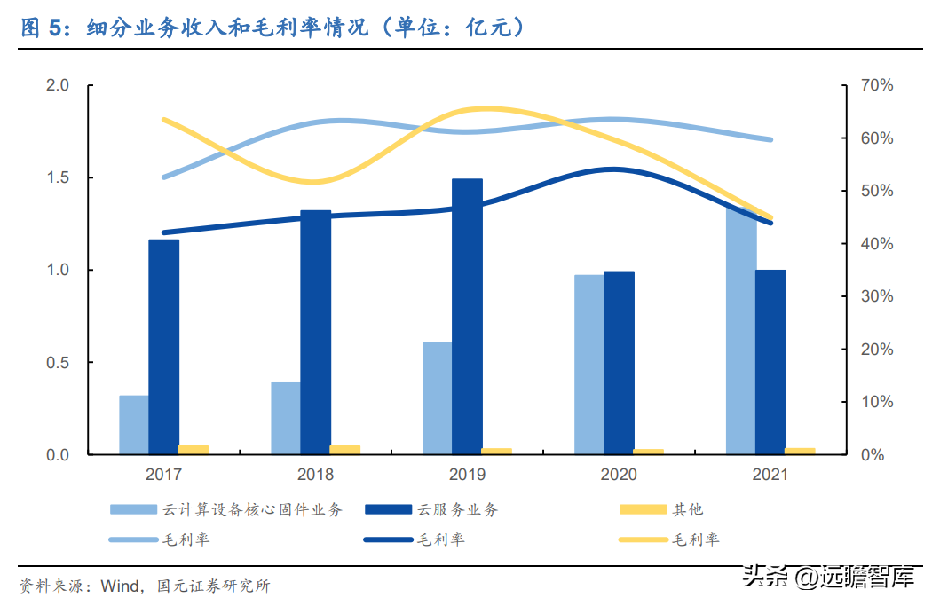2017-2021 年,云服务业务分别实现收入 1.16、1.32、1.49、0.99、1.00 亿元,毛利率分别为 42.09%、45.02%、46.95%、54.03%、43.89%;云计算设备核心固件业务分别实现收入 0.32、0.39、0.61、0.97、1.34 亿元,该业务收入快速增长,且毛利率较高,近四年在 59-64% 之间波动。