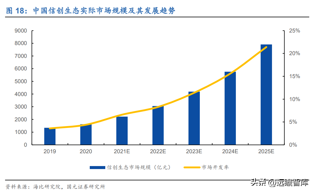 根据海比研究院《2021 年中国信创生态市场研究报告》,2020 年中国信创生态市场实际规模为 1617 亿元,2025 年将达到 7911 亿元,2021-2025 年的复合增长率达到 37.4%,市场潜力十分巨大。