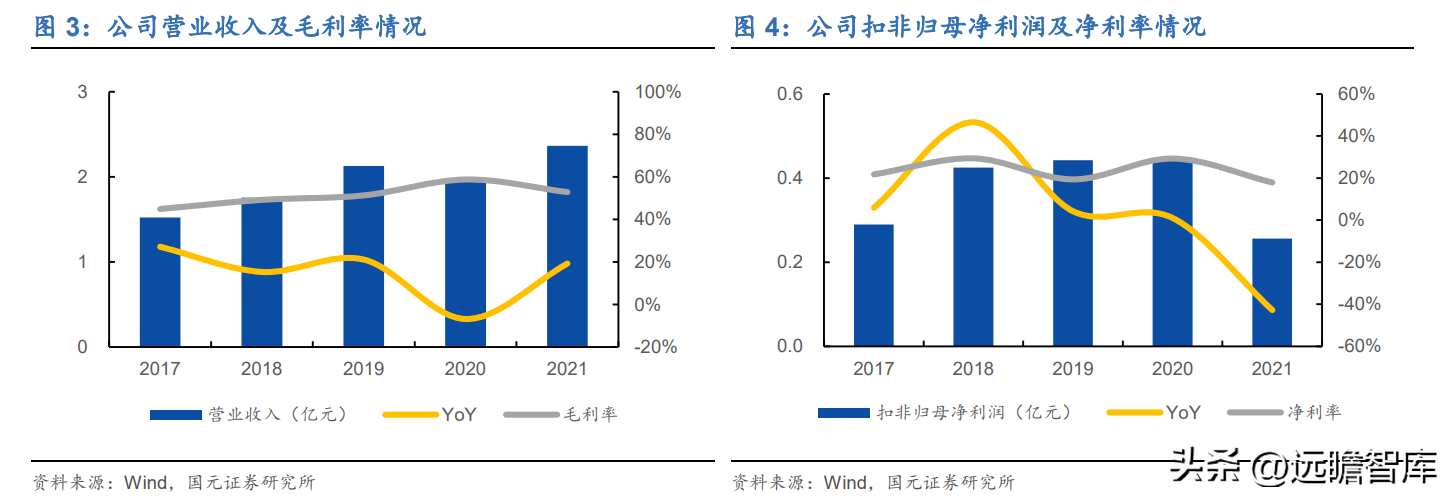 2017-2021 年,公司的扣非归母净利润和净利率波动较大,近三年扣非归母净利润增速下滑明显,主要系公司加大研发投入与新冠肺炎疫情影响。2021 年,公司实现营业收入 2.37 亿元,同比增长 19.25%,实现扣非归母净利润为 0.26 亿元,同比下降 42.79%。