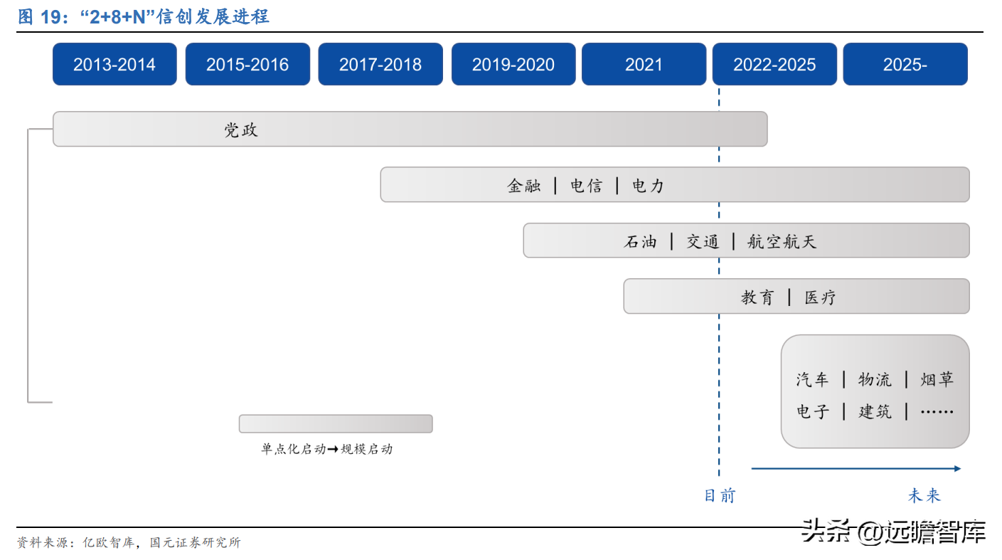 行业信创中,金融行业首当其冲,推进速度最快,电信紧随其后,能源、交通、航空航天处于第二梯队,教育、医疗也在逐步进行政策推进和试点。汽车、物流、烟草等 N 个行业的信创预计 2023 年左右开始启动。
