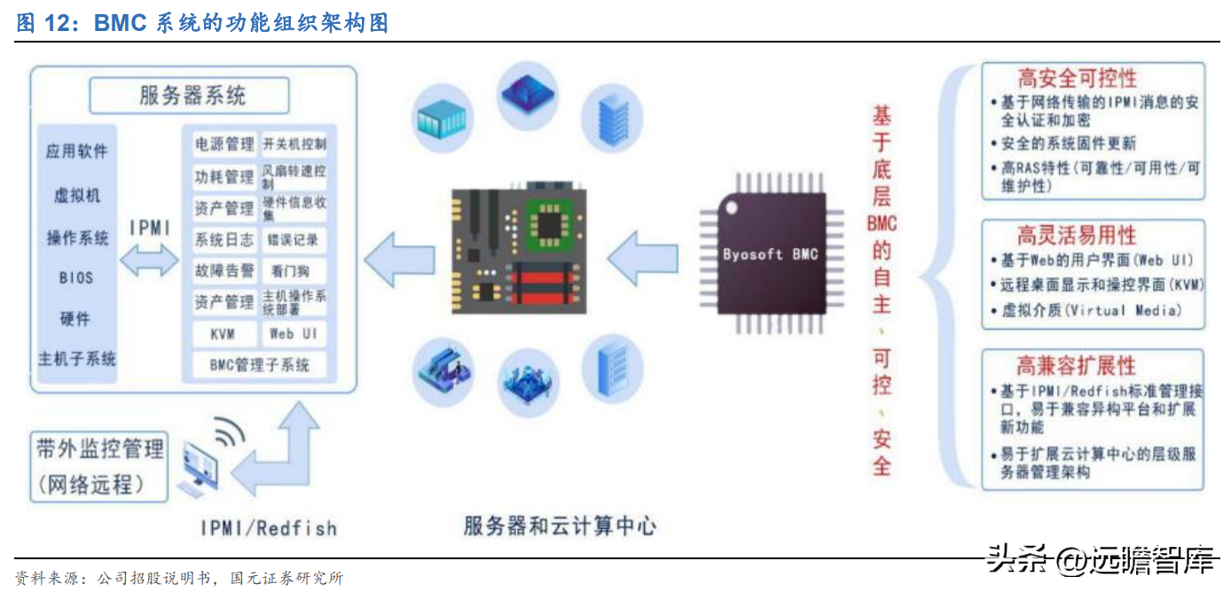 BMC(Baseboard Management Controller)固件: 是一组固化到服务器主板上一个存储芯片中的系统程序,是服务器的基本核心功能子系统,负责服务器的硬件状态管理、操作系统管理、健康状态管理、功耗管理等核心功能,可以实现对服务器的远程监控,几乎对整个服务器系统有完全的控制权,是服务器和云计算产业的核心共性技术。