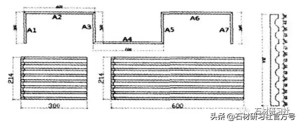 如图7中A1的右与A2的左进行拼接,如果颠倒后将A1的左与A2的左拼接,可能就会出现拼接不上的现象或拼接错位。此类产品在没有编号,没有注明安装方向的情况下,那么施工方就以为都是一样,安装随意。从理论上讲,这种拉槽属于轴对称图形,怎样安装都可以,但是实际上由于加工上机器的精度的问题、人工打磨抛光技术的差异问题,会使产品出现误差。尤其槽数越多,累计误差越大,安装错位越明显。图8的情形也是如此:因此对这类产品必须认真编号,准确标向,方能减少安装的误差,确保安装的质量。