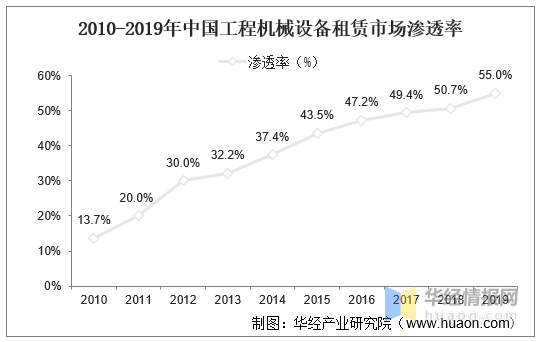 从工程机械设备市场渗透率情况来看,我国工程机械设备租赁市场渗透率持续攀升。据统计,我国工程机械设备租赁市场渗透率由2010年的13.7%上升至2019年的55.0%。
