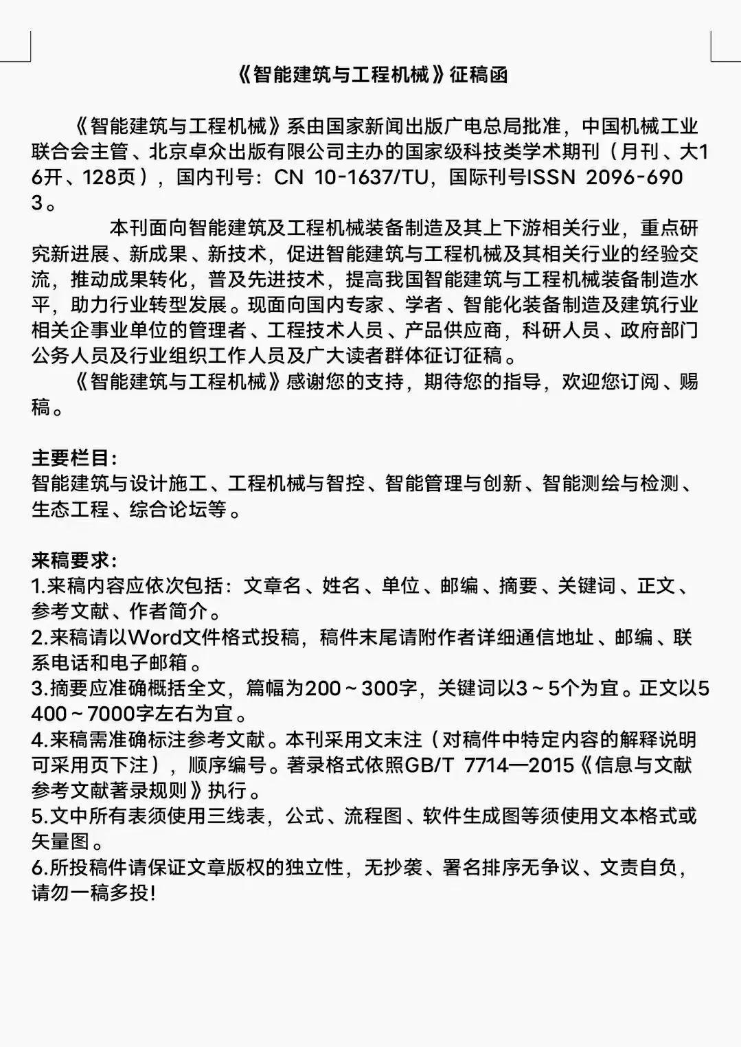 《智能建筑与工程机械》收2023年9期10月-11月左右出刊 郭嘉级,月刊,万方维普全文收录, 3版5400字符 起发