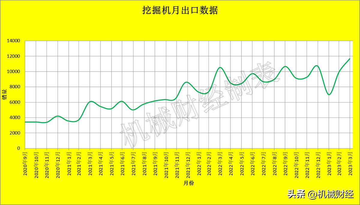 挖掘机出口数量正动态上升中,本年3月份又一次刷新了挖掘机单月出口量数据,11679台为新的纪录!