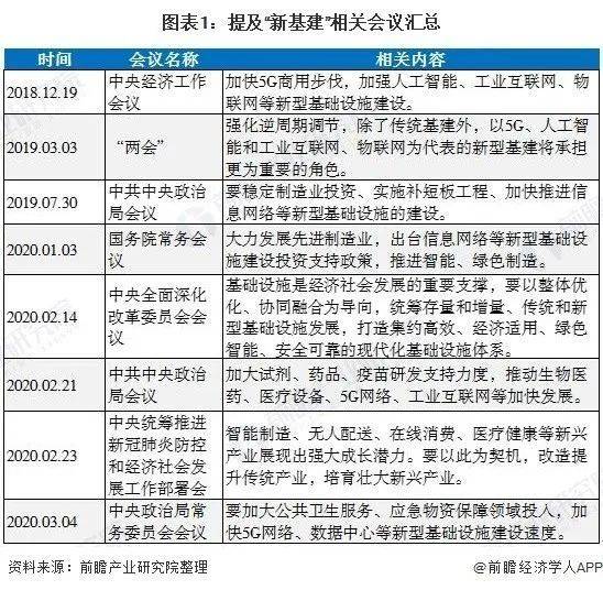 2018年年底的中央经济工作会议提出“加快5G商用步伐,加强人工智能、工业互联网、物联网等新型基础设施建设”,新基建的概念由此产生,并被列入2019年政府工作报告;2020是全面建成小康社会和“十三五”规划收官之年,原本处于经济结构转型和贸易战压力下的中国经济又遭受新型冠状病毒疫情的冲击,新基建作为重要的逆周期调节手段,在多次会议中被频繁提及。