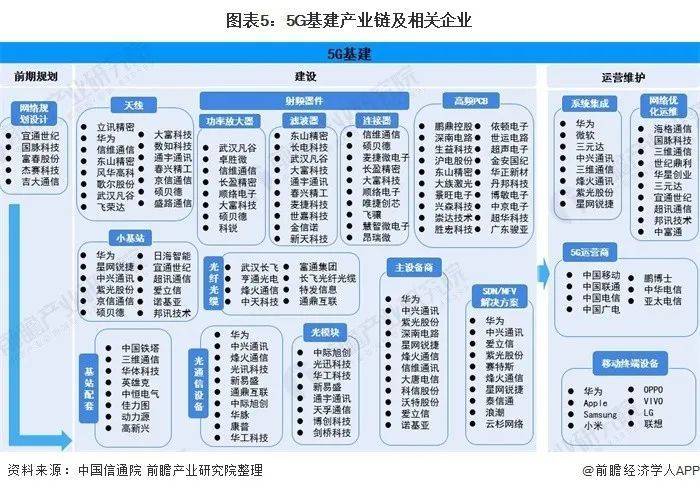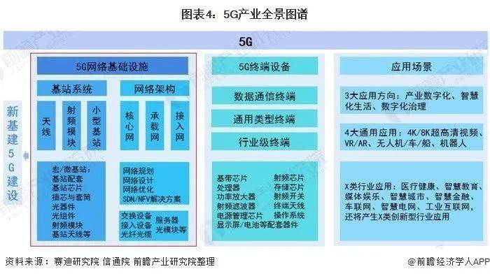 5G产业链条非常之广,含零部件、主设备、运营商和下游应用等环节。前期投入主要包括无线设备、传输设备、基站设备、小基站、光通信设备、网络规划实施等。从应用方向上看,5G应用包括产业数字化、智慧化生活、数字化治理三大方向;5G通用应用(即未来可能应用于各行业各种5G场景的应用)包括4K/8K超高清视频、VR/AR、无人机/车/船、机器人四大类;5G应用到工业、医疗、教育、安防等领域,还将产生X类创新型行业应用。