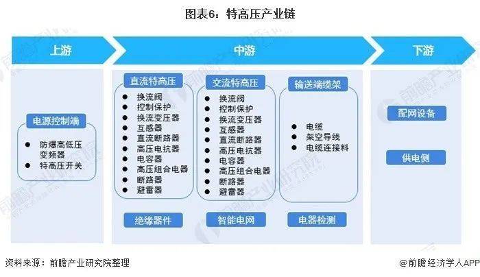 特高压相关产业链可以分为上游的电源控制端、中游的特高压传输线路与设备、下游的配电设备。其中特高压线路与设备是特高压建设的主体,可进一步分为交/直流特高压设备、缆线和铁塔、绝缘器件、智能电网等。