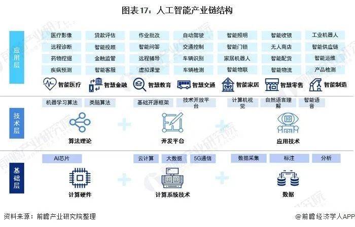 人工智能产业链包括三层:基础层、技术层和应用层。其中,基础层是人工智能产业的基础,为人工智能提供数据及算力支撑;技术层是人工智能产业的核心;应用层是人工智能产业的延伸,面向特定应用场景需求而形成软硬件产品或解决方案。