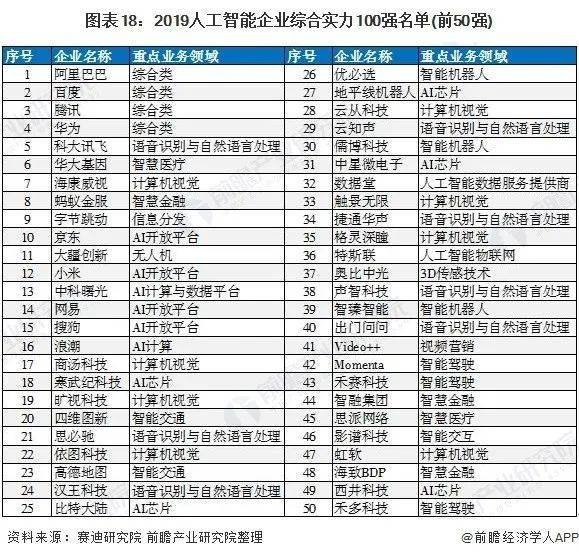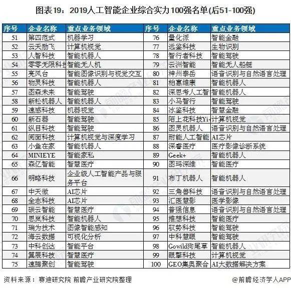 赛迪研究院发布了《2019赛迪人工智能企业百强榜研究报告》。报告从基础指标、企业成长性、创新能力、团队能力四个维度进行定量评比,对700余家中国人工智能主流企业进行定量评估,分别评选出2019人工智能企业综合实力百强、成长能力百强和创新能力百强企业。榜单如下,希望能提供参考意见。