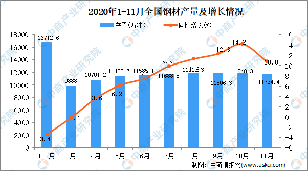 据中商产业研究院数据库显示,2020年11月全国钢材产量为11734.4万吨,同比增长10.8%。2020年1-11月全国钢材产量为120202.8万吨,同比增长7.0%。