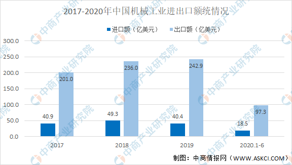 据海关总署数据显示,我国机械设备的出口远远大于进口,2017-2019年进出口额持续增长。2020年因新冠疫情影响,工程机械的进出口受到严重打击,预计在2021年在海外疫情的防控下疫情有所好转的话,我国工程机械的进出口市场将会回温。