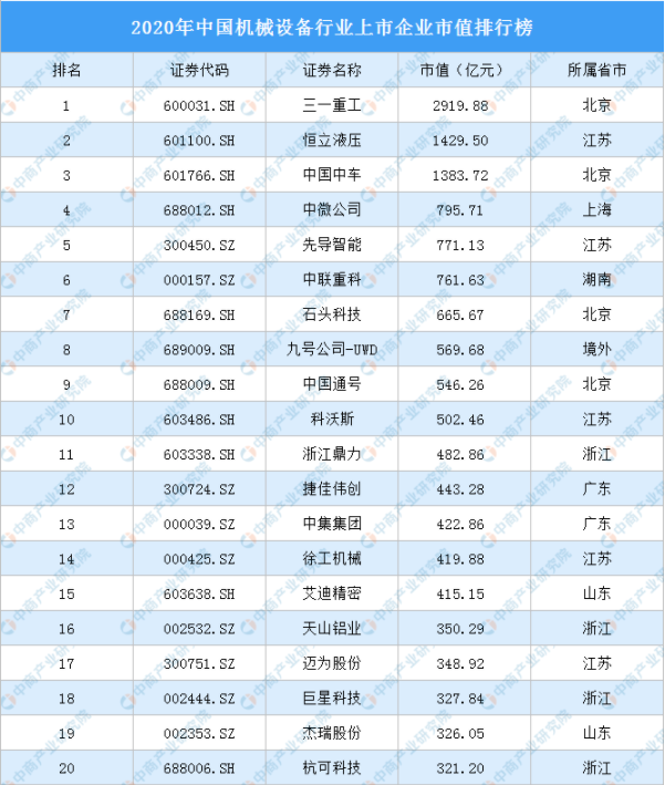 据不完全统计,截止到2020年12月30日,2020年中国机械设备行业412家上市企业总市值累计达3.46万亿元。其中,三一重工总市值排名第一,达到2919.88亿元。根据中商产业研究院统计,2020年中国机械设备行业412家上市企业市值前三排名企业依次为三一重工、恒立液压、中国中车其中,市值超过千亿元的企业共计3家,分别为三一重工、恒立液压、中国中车,市值分别为2919.88亿元、1429.50亿元、1383.72亿元。