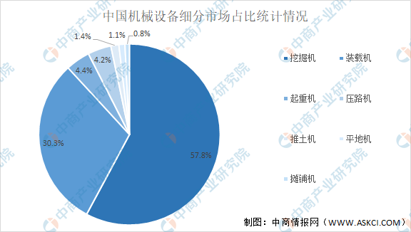 数据显示,我国机械工业种类繁多,其中挖掘机占比最大为57.8%,其次是装载机占比30.3%,第三为起重机占比4.4%。