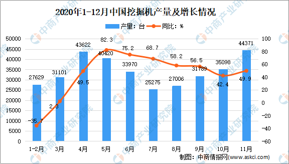 挖掘机又称挖土机,是用铲斗挖掘高于或低于承机面的物料,并装入运输车辆或卸至堆料场的土方机械。从近几年工程机械的发展来看,挖掘机的发展相对较快,挖掘机已经成为工程建设中最主要的工程机械之一。数据显示,2020年11月全国挖掘机产量为4.41万台,同比增长49.9%。2020年1-11月全国挖掘机产量为35.17万台,同比增长34.7%。