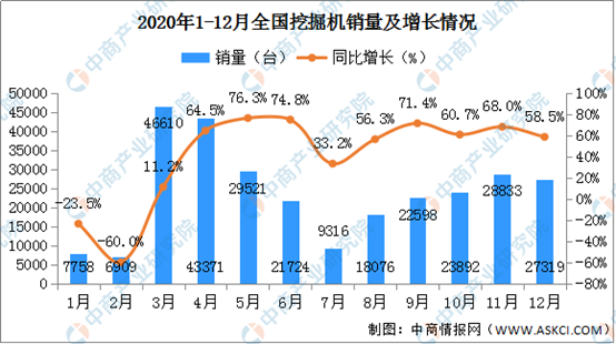 数据显示,2020年12月中国共计销售各类挖掘机械产品31530台,同比增长56.4%。其中,国内市场销量27319台,同比增长58.5%。此外,11月挖掘机出口4211台,同比增长44.4%。