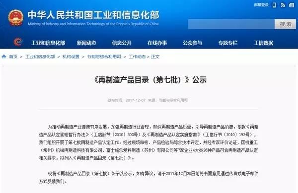 同样从工信部的网站了解到,从2011年至2017年,工信部共公布了七批再制造产品目录,从2011年公布第一批再制造产品目录中看到工程机械行业的再制造产品目录均为柳工产品。
