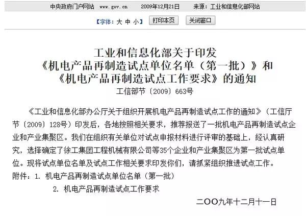 国家工信部于2009年发布了首批35家再制造试点企业名录,2011年1月28日,工信部批复10家单位再制造试点实施方案,其中工程机械行业有徐工集团工程机械有限公司、广西柳工机械有限公司、三一集团有限公司共三家公司。