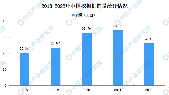 2022年1-12月,共销售挖掘机261346台,同比下降23.8%;其中国内151889台,同比下降44.6%;出口109457台,同比增长59.8%。
