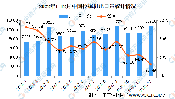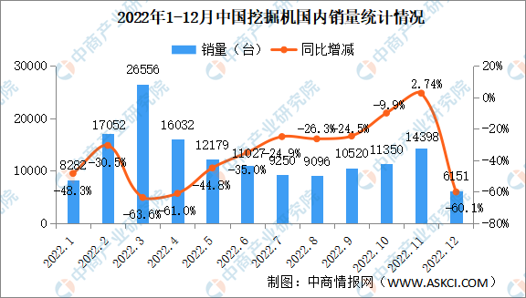 2022年12月销售各类挖掘机16869台,同比下降29.8%,其中国内6151台,同比下降60.1%;出口10718台,同比增长24.4%。
