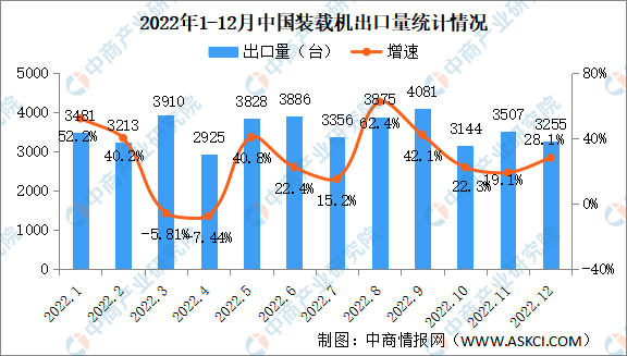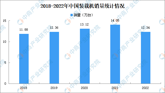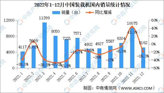 2022年12月销售各类装载机8417台,同比下降4.97%。其中国内市场销量5162台,同比下降18.3%;出口销量3255台,同比增长28.1%。2022年1-12月,共销售各类装载机123355台,同比下降12.2%。其中国内市场销量80894台,同比下降24%;出口销量42461台,同比增长24.9%。2022年1-12月共销售电动装载机1160台(5吨878台,6吨282台),其中12月销售77台。
