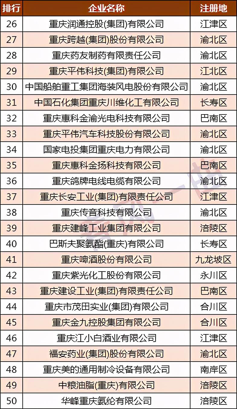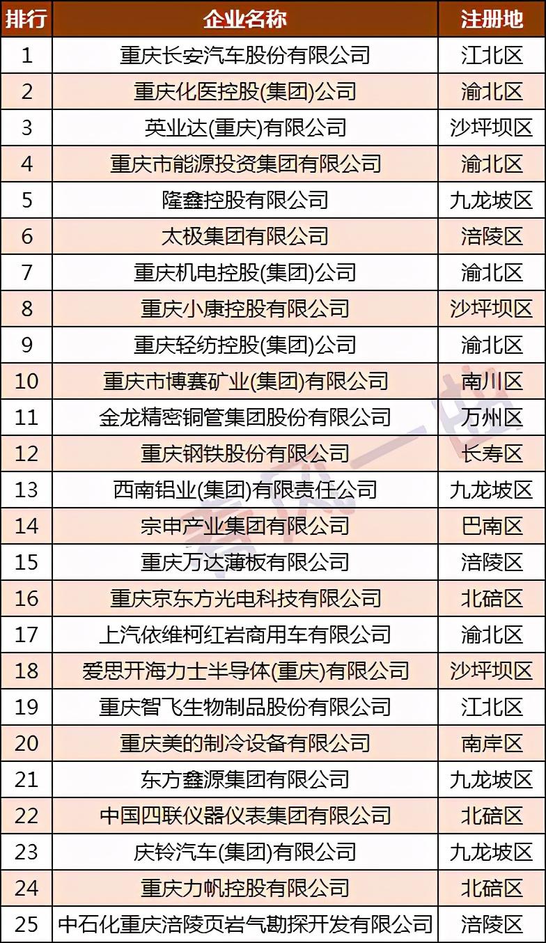 重庆市规模最大的十家制造业企业,从区域分布来看,有4家位于渝北区,2家位于沙坪坝区,1家位于江北区,1家位于九龙坡区,1家位于涪陵区,1家位于南川区。