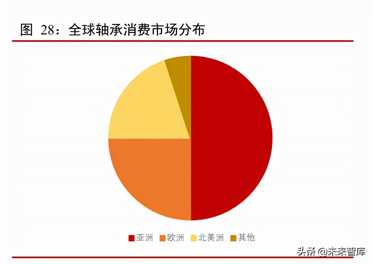 轴承的下游应用领域主要是汽车、家电、电机行业,分别占 37.4%、12.4%、10.6%, 共约占 60%。 纺织机械、摩托车、农机拖拉机、工程机械分别占 5.3%、4.4%、2.2%、 2.0%,轴承使用比例较小。