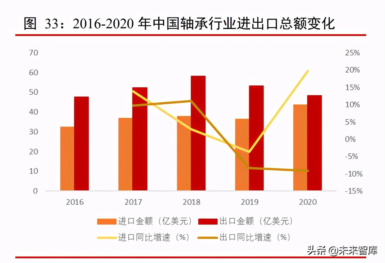 国内轴承的出口数量远大于进口数量。 2020 年出口数量 58.81 亿套,同比下降 0.1%;进口数量达新高至 25.18 亿套,同比增长 12.76%。2020 年轴承行业出口金额为 48.34 亿 美元,同比下降 9.15%,进口金额 43.66 亿美元,同比上升 19.78%,2020 年进出口差距 大幅收窄至 4.68 亿美元的贸易顺差金额。