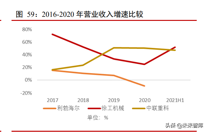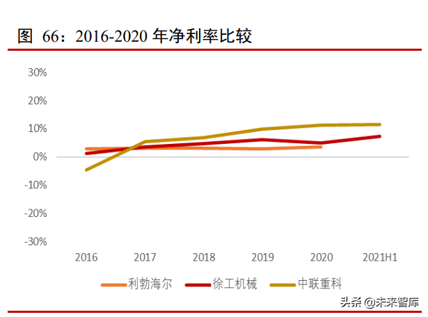 中联重科成长速度较快,利勃海尔和徐工机械营收增速逐渐放缓。 2020 年利勃海尔、 徐工机械、中联重科的营收分别为 871.43 亿元、739.68 亿元、651.08 亿元,分别同比增 长-9.54%、25.00%、50.34%。总体来看,徐工机械、中联重科逐渐赶上利勃海尔。2021H1 徐工机械和中联重科分别实现营收 532.33 亿元、424.49 亿元,分别同比增长 51.80%、 47.25%。