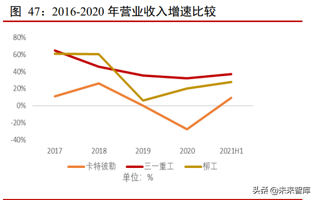 卡特彼勒营收规模远高于国内企业。 2016-2020 年呈倒挂趋势,2018 年营收触顶后 回落,年复合增长率为 0.47%。2020 年营收为 2724.02 亿元,同比下降 22.40%。2021H1 营收为 1600.55 亿元,同比增长 20.09%。三一重工 2016-2020 年营收规模增速较快,年 复合增长率为 43.98%。2020 年营收为 1000.54 亿元,同比增长 31.25%,仅为卡特彼勒 营收的 36.73%。2021H1 营收为 674.98 亿元,同比增长 36.25%。柳工营收增长趋势较为 缓慢,营收规模相比卡特彼勒和三一重工仍有距离。2020 年营收为 230.02 亿元,同比 增长 19.95%。2021H1 营收为 147.88 亿元,同比增长 28.05%。