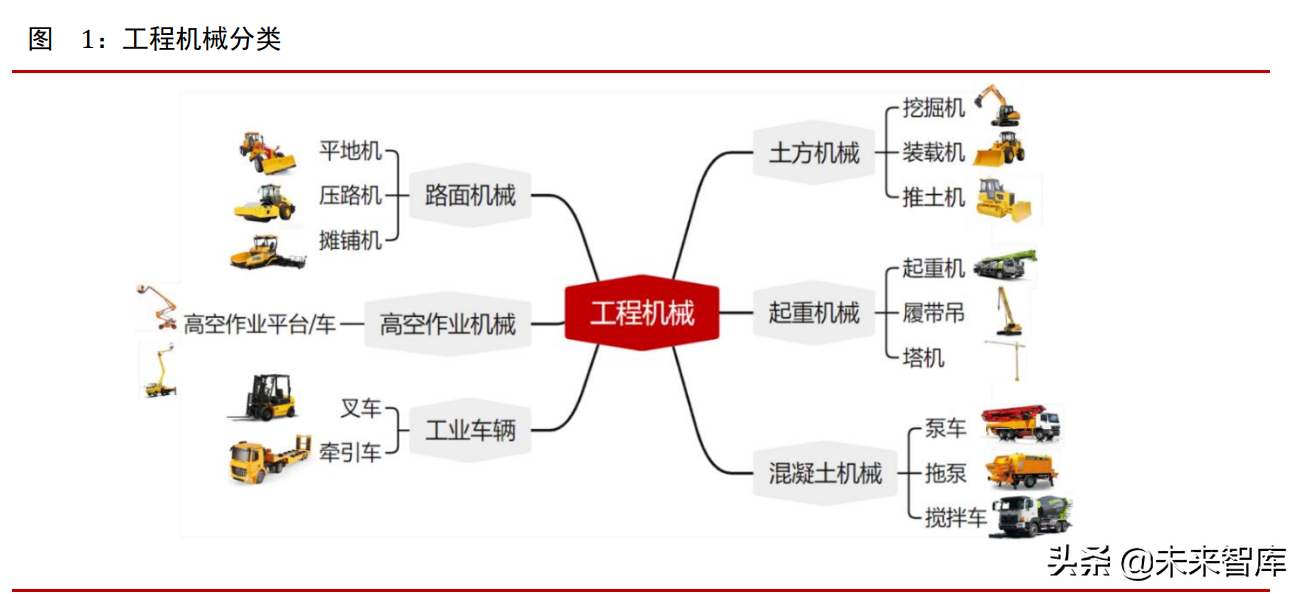 工程机械设备主要细分类别为土方机械、起重机械、混凝土机械、路面机械、高空 作业机械、工业车辆等。其中,土方机械广泛用于建筑施工、水利建设、道路构筑、机 场修建、矿山开采 、码头建造、农田改良等工程中,主要作用为挖掘、铲运、推运或 平整土壤和砂石等。代表工程机械为挖掘机、装载机、推土机等。
